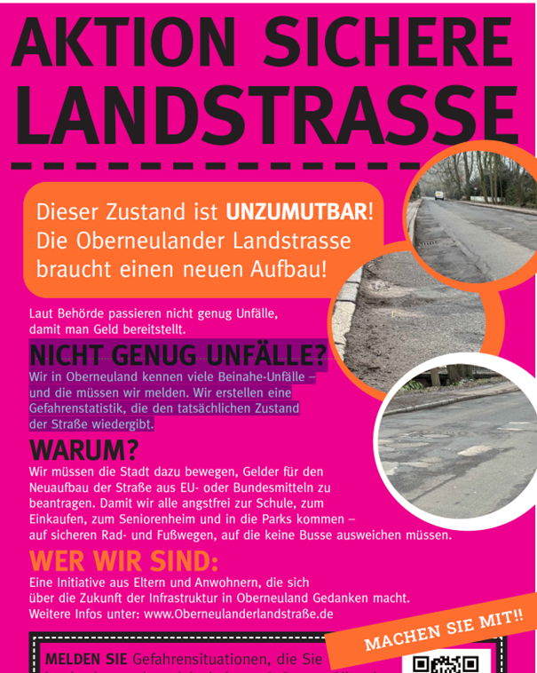Am Samstag, den 17. Mai, wird es sichtbar: Oberneuland steht auf – für eine Straße, die endlich sicher ist. Von 11 bis 14 Uhr laden wir herzlich zum Aktionstag der Initiative „Sichere Oberneulander Landstraße“ in den Barlachweg ein.Denn egal ob zu Fuß, mit dem Fahrrad, mit dem Auto, dem Bus oder dem Kinderwagen – die Oberneulander Landstraße ist für niemanden wirklich sicher oder angenehm zu nutzen.Die Fahrbahn ist marode, die Ränder sind ausgefranst, Radwege fehlen komplett, Fußgänger werden an den Rand gedrängt, und auch Autofahrer und der Busverkehr kämpfen täglich mit Ausweichmanövern, engen Kurven und unübersichtlichen Situationen. Wir sagen: So darf es nicht bleiben. Unsere Forderung ist klar: Eine sichere, zeitgemäße Straße für alle – statt Flickwerk und Verdrängung. Mit dem fast abgeschlossenen Schulneubau verschärft sich die Lage weiter – es braucht jetzt eine Lösung, die alle Verkehrsteilnehmer mitdenkt, den Stadtteil entlastet und die Sicherheit in den Vordergrund stellt.